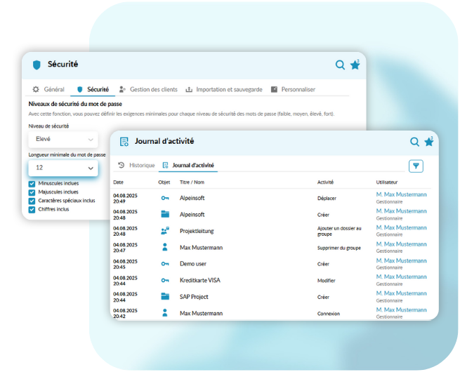 Complexité des mots de passe, canaux d’accès autorisés ou droits basés sur les rôles – avec PassSecurium™, vous définissez vos politiques de sécurité de manière centralisée et flexible. Vous choisissez quels services peuvent accéder aux mots de passe via l’application, le navigateur ou le bureau, et adaptez les règles selon les départements ou les types d’accès. L’interface peut également être adaptée à l’image de votre entreprise si vous le souhaitez.